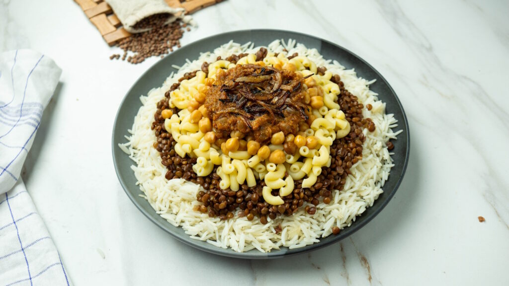 – Voeg in de serveerschaal gekookte rijst, gekookte hele zwarte linzengram, gekookte macaroni, gekookte kikkererwten, bereide tomatensaus, gebakken ui toe en serveer.