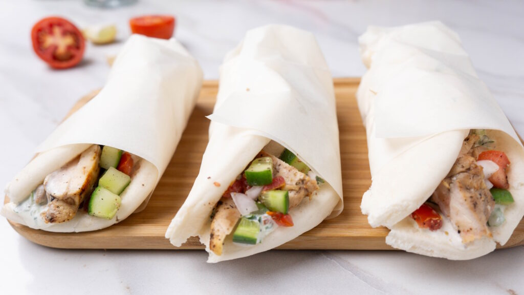 – Neem een pitabroodje of platbrood (bij voorkeur opgewarmd) en leg dit op een stuk bakpapier (of gebruik aluminiumfolie). Leg wat salade in het midden van het brood en beleg met kip en tzatziki.