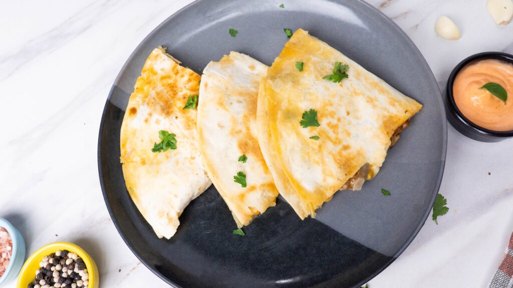 – Plaats de quesadilla in de koekenpan en druk lichtjes aan. Kook gedurende 3 minuten tot de onderkant super goudbruin en knapperig is.