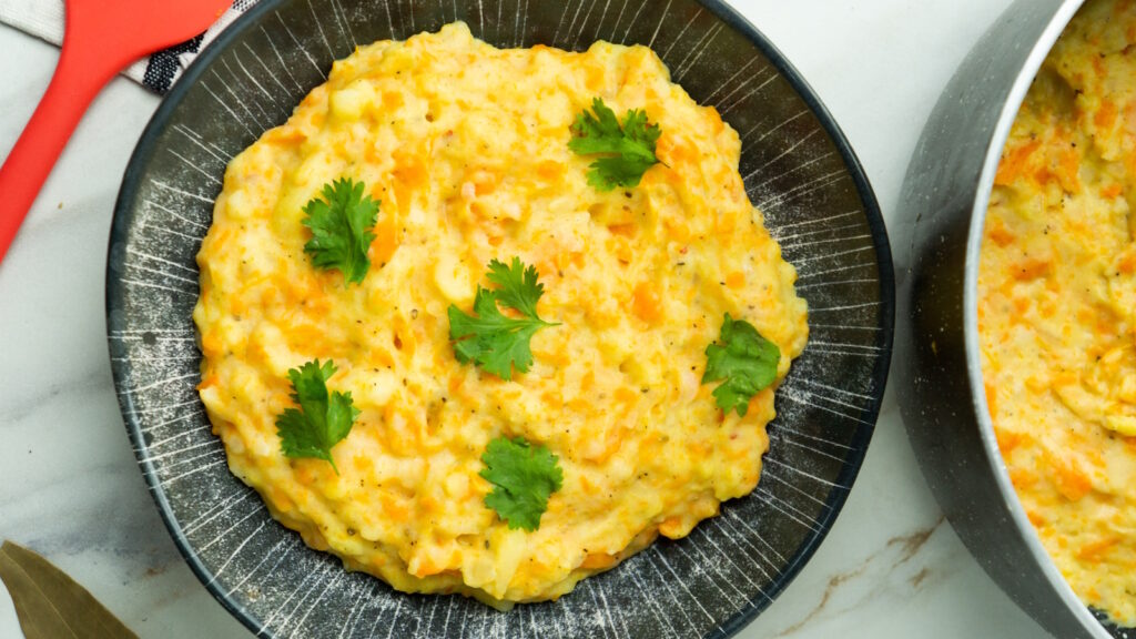 – Giet 150 ml melk erbij en voeg 50 gram boter toe. Pureer alles en breng op smaak met pittige mosterd, gehakte selderijblaadjes, zout en peper.